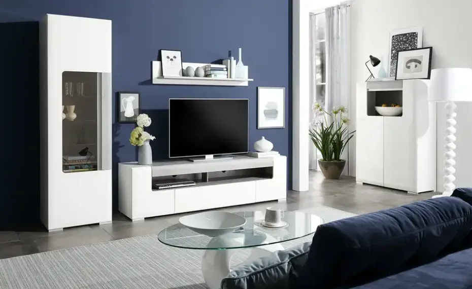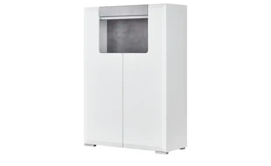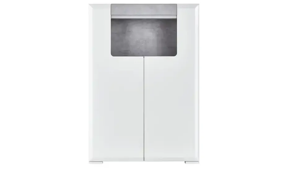 Das Highboard Puro ist eine Bereicherung für Ihren Wohnraum. Es sieht modern aus – und verfügt über Stauraum. Je Tür können Sie drei große Fächer nutzen. Darüber hinaus gibt es ein offenes Fach. Die Rückwand und eine Absetzung über dem Fach sind in Beton (Nachbildung) gehalten. Sie setzen damit kontrastreiche Akzente zum Weiß der hochglänzenden Front. Der Korpus ist alpinweiß und hat ein edles, mattes Finish. Die LED-Beleuchtung unter der Beton-Optik sorgt für ein schönes Ambiente – vor allem bei Dunkelheit.