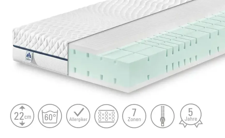 Kern: ca. 20 cm hoher 7 Zonen Schaumkern – Mittelteil mit 3D Kontur aus Hybridschaum; beidseitige Rhombotherm Auflage aus Softschaum