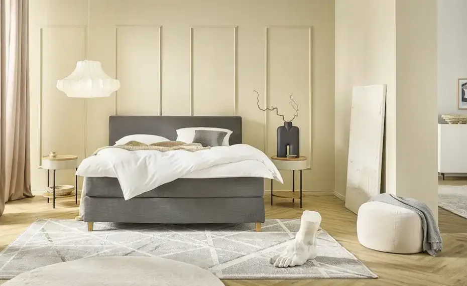 Das Boxspringbett Jette Flex zeigt sich in minimalistischem Design. Liebevolle Details, wie der geriffelte, weiche Cordbezug und die Eichen-Massivholzfüße setzen dabei gekonnte Akzente. Die zurückhaltende Bezugsfarbe drängt sich nicht auf – So passt das Boxspringbett Jette Flex in diverse Schlafzimmer-Einrichtungsstile. Komfortabel wird es durch die Kombination aus Bonnell- und Tonnentaschenfederkernen in Box und Matratze. Durch den mitgelieferten Topper wird Ihr Schlaferlebnis zusätzlich abgerundet. Stellen Sie sich Ihre zukünftige Schlafoase ganz nach Ihren Wünschen zusammen und wählen Sie Ihren bevorzugten Matratzenhärtegrad ganz einfach aus. Übrigens: Ergänzen Sie das Boxspringbett Jette Flex mit der gleichnamigen Bettbank der Serie. Diese bietet praktischen Stauraum für Bettwäsche und Co.
