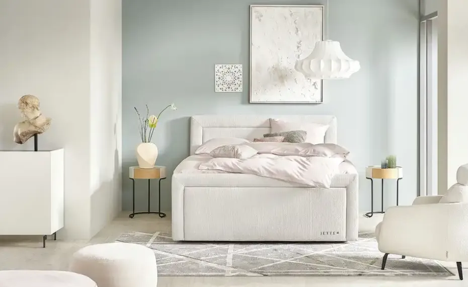 Sein gradliniges, minimalistisches Design macht das Boxspringbett Jette Frame zu einem wahren Kombinationstalent. Das gesamte Bett ist mit einer weichen Mikrofaser in Samtoptik bezogen und kann dadurch auch von der Wand abgerückt oder sogar als optischer Raumteiler verwendet werden. Machen Sie es sich bequem und genießen Sie höchsten Komfort. Dank der Bonnellfederkerne in der Box, den Tonnentaschenfederkernen in der Matratze und dem mitgelieferten Topper steht einem erholsamen Schlaf nichts mehr im Weg. Außerdem praktisch: Durch die Klett-Fixierung besitzen Matratze und Box einen Anti-Rutsch-Effekt. So bleibt alles an seinem Platz. Entscheiden Sie sich nur noch für Ihren favorisierten Matratzenhärtegrad und wählen Sie Ihre Lieblingsfarbe für den Bezug.