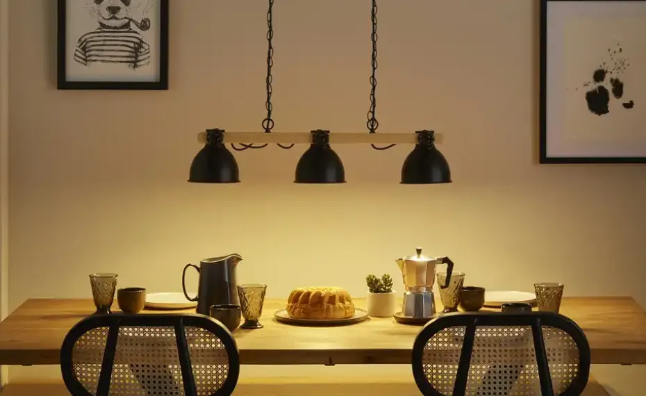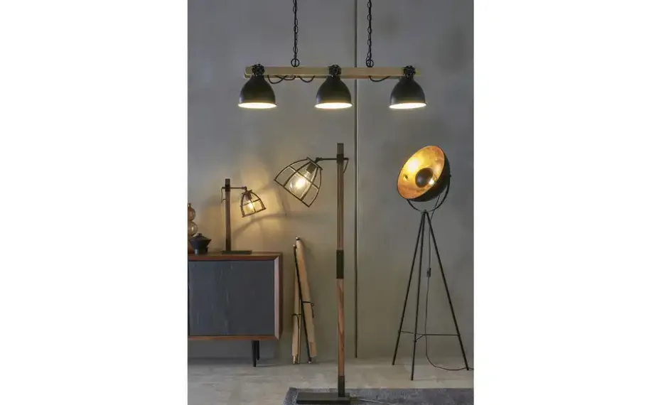 KHG Pendelleuchte, 3-flammig, schwarz mit Pinienholz