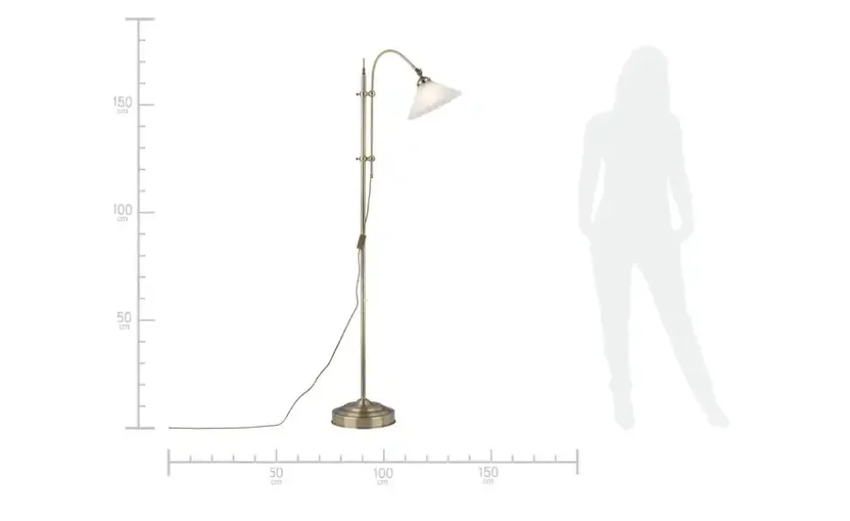 Mit dieser einflammigen Stehleuchte erwerben Sie nicht nur ein Accessoire, das jederzeit für ein angenehmes Licht in Ihren Arbeits- und Wohnräumlichkeiten sorgt. Die Leuchte in klassischem Design fügt sich auch als dekorativer Blickfang in Ihre Einrichtung ein. Das Messinggestell stellt dabei einen harmonischen Kontrast zum alabasterfarbenen Schirm dar und rundet das attraktive Bild ab.