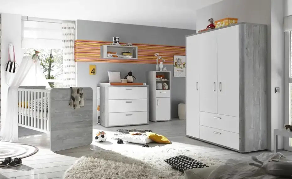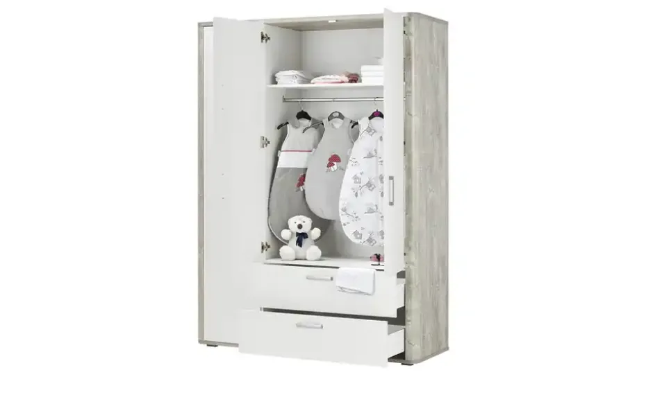Passend zur Babyzimmerserie Hannes ist dieser Kleiderschrank. Der Korpus in Altholz Grau (Nachbildung) wird von weißen Fronten abgesetzt. Der Platz im Inneren des Schrankes ist gut unterteilt. Babykleidung lässt sich so ordentlich unterbringen.