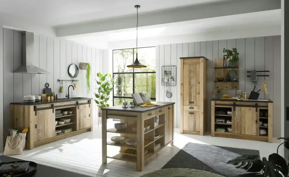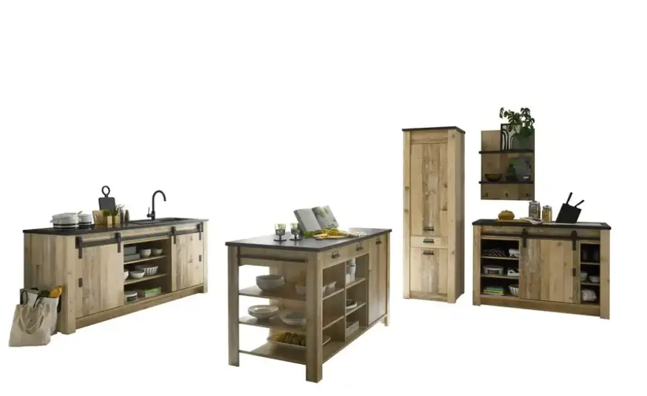 Gesamtmaße gelten für Spültisch; Spültisch 2: 201/64/93 cm; Insel: 162/77/93 cm; Wandregal: 60/22/85 cm; Stauraumschrank: 62/64/201 cm (B/T/H)