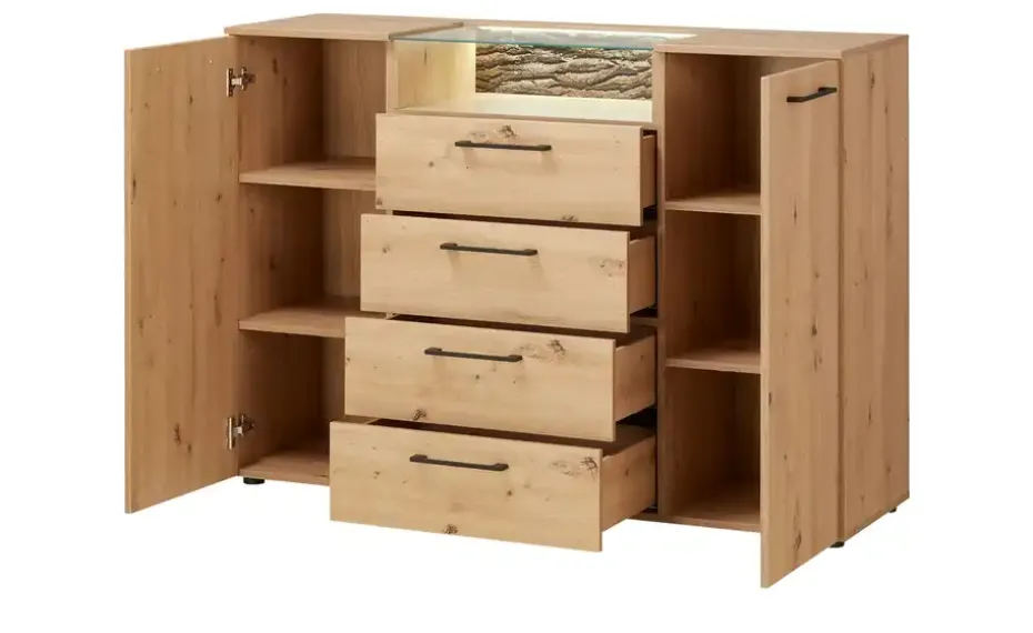 offenes Fach mit Beleuchtung und Rückwand Rindenoptik