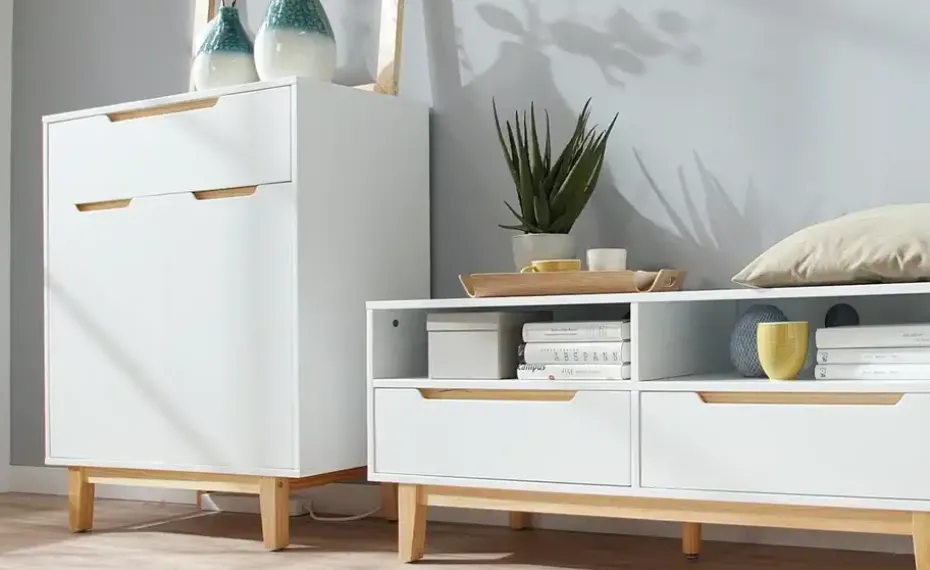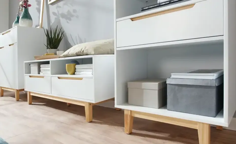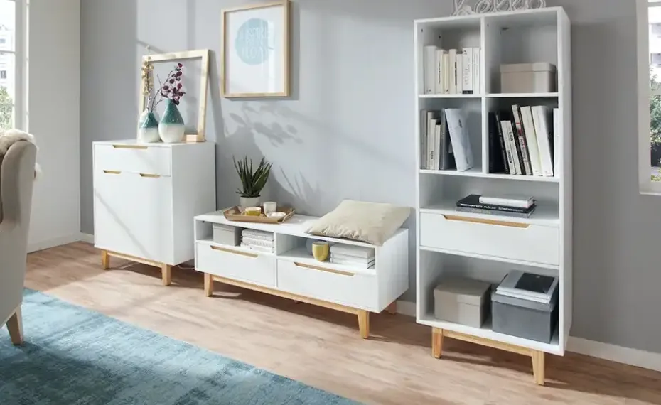 Brescia ist eine Kommode im frischen Scandi-Design. Die geradlinige, reduzierte Form wird mit einem strahlenden Weiß kombiniert. Alle weißen Flächen sind hochwertig lackiert worden. Hinzu kommen Akzente in Kiefer Natur, so zum Beispiel die Absetzungen an der Front und das Gestell. Bei beiden handelt es sich um Massivholz, das zum Schutz lackiert worden ist. Brescia verfügt über eine Schublade und zwei Türen. Der Platz hinter den Türen unterteilt sich in zwei Fächer.