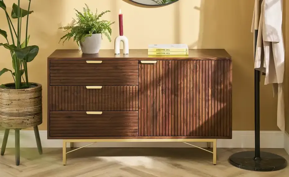 Dunkle Akazie und edle, goldfarbene Akzente: Das sind die Markenzeichen der Serie Dorado. Die Fronten der drei Schubfächer und der Tür sind mit einem attraktiven Relief verziert. Dahinter steht Ihnen praktischer Stauraum zur Verfügung. Getragen wird die Kommode von einem goldfarbenen Gestell, das wunderbar mit dem Akazienholz harmoniert. Unser Tipp: Bleiben Sie dem Stil treu und ergänzen Sie Ihr Wohnzimmer mit dem gleichnamigen TV-Lowboard oder dem Highboard der Serie.