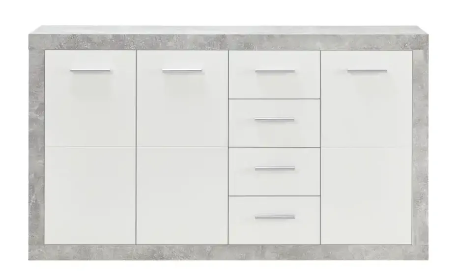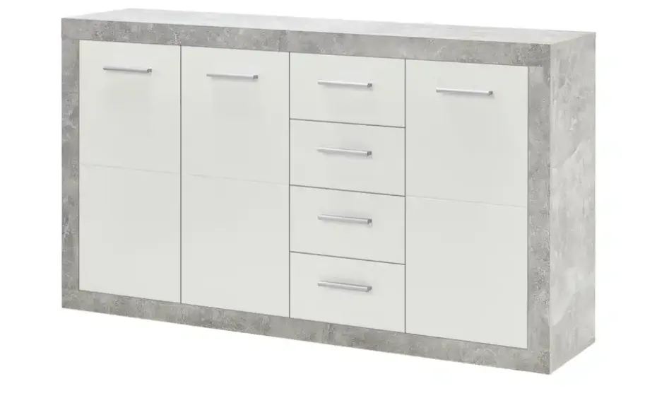 Ein Stauraumwunder ist die Kommode Puro. Hinter den drei Türen befinden sich vier große Fächer, die Sie vielseitig nutzen können. Hinzu kommen mittig außerdem vier Schubladen. So kriegen Sie viel in der Kommode verstaut. Puro hat eine Front in puristischem Weiß mit Hochglanz. Der Korpus setzt sich in grauer Beton-Optik ab.