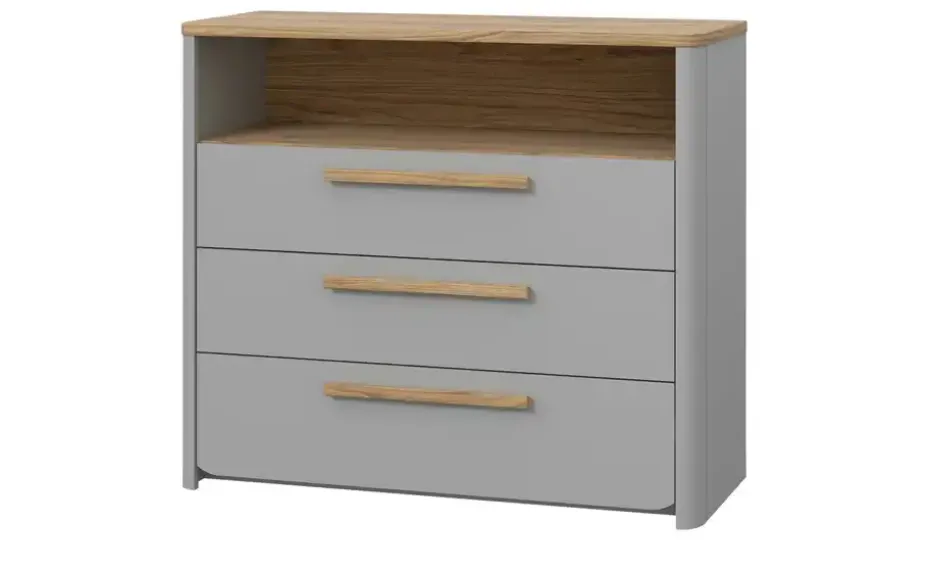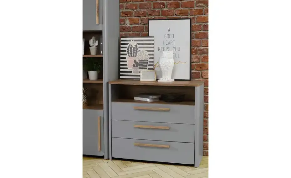 Diese Serie verbindet modernes Grau mit natürlichen Akzenten aus Catania-Eichennachbildung. Das Ergebnis sind attraktive Möbel, die in zahlreichen Raumkonzepten Platz finden. Diese Kommode bietet blickdichten Stauraum in drei Schubfächern. Jedes Schubfach ist in zwei Bereiche eingeteilt, sodass Sie besonders gut Ordnung halten können. Ein offenes Fach und die ca. 41 x 99 Zentimeter große Ablagefläche bieten dagegen Platz für Bücher, Dekokörbe und Mehr.