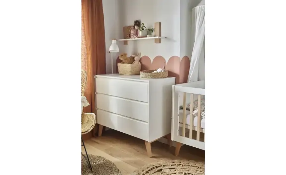 Weiße, grifflose Fronten und attraktive Massivholzfüße für eine Scandi-Note machen diese Kommode aus. Verstauen Sie Ihre Sachen in den drei geräumigen Schubfächern und platzieren Sie Deko, Bilderrahmen oder Bücher auf der 100 x 52,5 Zentimeter großen Ablagefläche. Die Schubfächer schließen dank Soft-Close nahezu lautlos. Übrigens: Mit der gleichnamigen, separat erhältlichen Wickelauflage verwandeln Sie die Kommode in einen praktischen Wickeltisch.