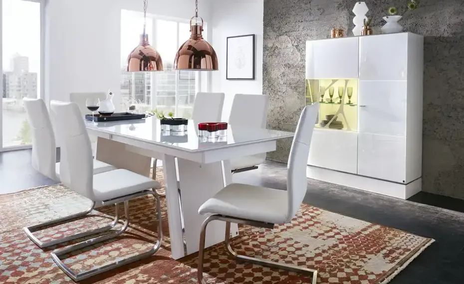 Der Esstisch Cube von LEONARDO hat eine exzellente, langlebige Qualität – so wie Sie sie von der Marke kennen. Der gesamte Tisch ist hochwertig lackiert. Die rechteckige Tischplatte verfügt zusätzlich über eine Oberfläche aus ESG-Sicherheitsglas. Es ist besonders robust und auch leicht zu pflegen. Etwaige Flecken können Sie ganz leicht wegwischen. Cube ist mit einem Gestellauszug ausgestattet. Dadurch können Sie die Tischplatte ganz leicht auf 240 Zentimeter Länge ausziehen. Je nach Länge der Tischplatte passen sechs bis zehn Personen an den Tisch. Cube hat ein zeitloses Design in Weiß. Leisten in Chromoptik setzen hochglänzende Akzente.