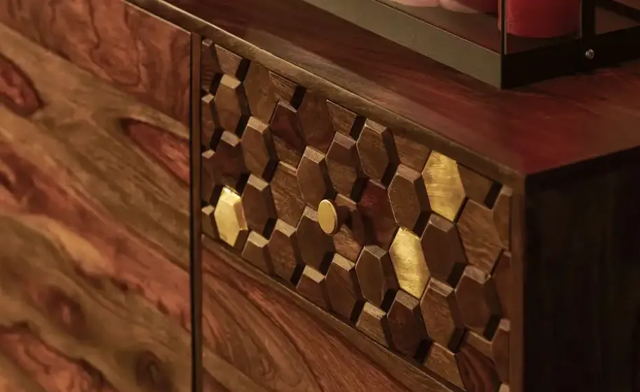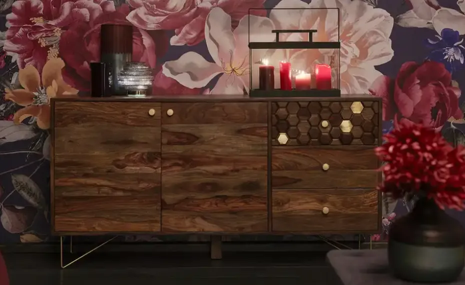 Die Serie Mitsu verbindet einzigartig gemasertes Sheesham-Holz mit sechseckigen Akzenten und goldfarbenen Details. Bei diesem Sideboard befindet sich das hexagonale Muster an einem von drei Schubfächern. Die anderen beiden Schubfächer und die beiden Türfronten hingegen sind aus Sheesham-Massivholz. Nutzen Sie die vier Fächer hinter den beiden Türen und verstauen Sie Kleinigkeiten in den drei blickdichten Schubfächern. Auf der 145 x 40 Zentimeter großen Oberseite können Sie Pflanzen, Bilderrahmen und andere Dekoelemente in Szene setzen. Unser Tipp: Bleiben Sie dem Stil treu und ergänzen Sie das Sideboard Mitsu mit dem gleichnamigen Bücherregal oder mit der Vitrine der Serie.