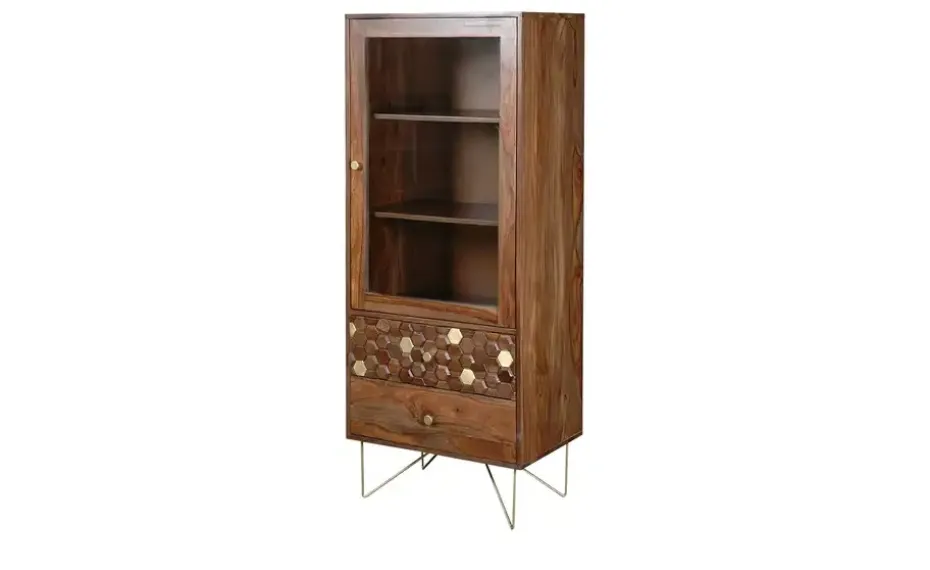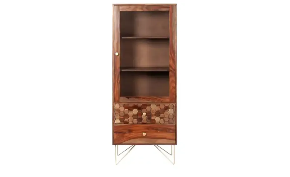 Die Serie Mitsu verbindet einzigartig gemasertes Sheesham-Holz mit sechseckigen Akzenten und goldfarbenen Details. Bei der Vitrine Mitsu ist eines von zwei Schubfächern mit dem hexagonalen Muster versehen. Das andere Schubfach hingegen ist aus Sheesham-Massivholz. Über den beiden Schubfächern stehen Ihnen drei einsehbare Fächer zur Verfügung. Platzieren Sie hier Dekoelemente wie Vasen oder setzen Sie andere Lieblingsdinge in Szene.