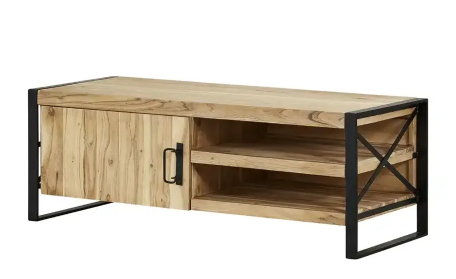 Massives Akazienholz und mattschwarze Metallkufenfüße erzeugen beim Lowboard Queens den beliebten Industrial-Look. Das einzigartig gemaserte Holz wurde gebeizt und lackiert und setzt einen schönen Kontrast zu den schwarzen Kufenfüßen. In den zwei offenen Fächer auf der rechten Seite können Sie Zeitschriften, Bücher oder Zubehör ablegen. Hinter der blickdichten Tür auf der linken Seite finden Sie zusätzlichen Stauraum. Das Lowboard Queens lässt sich nicht nur mit der gleichnamigen Serie kombinieren, sondern passt auch in weitere zahlreiche Einrichtungsstile.