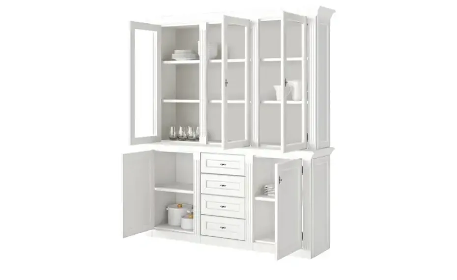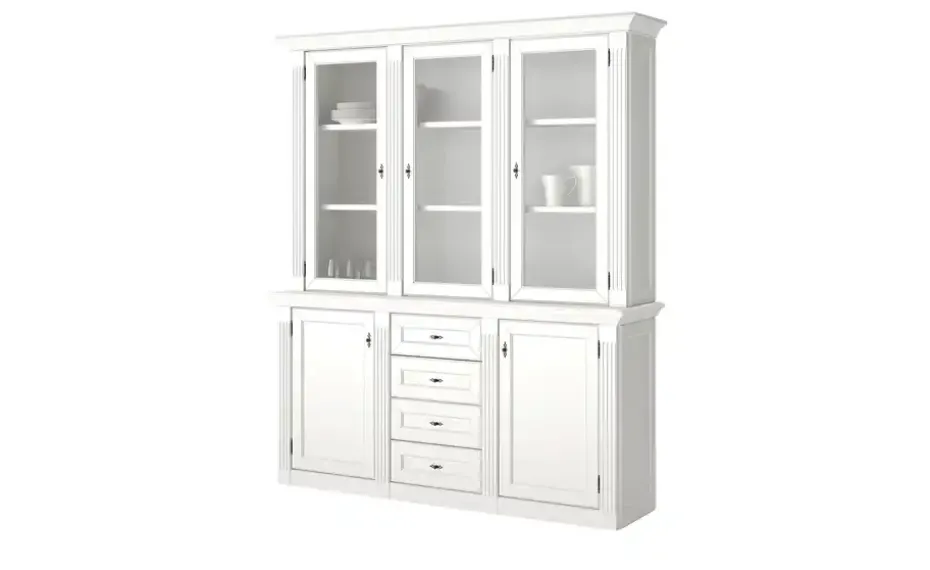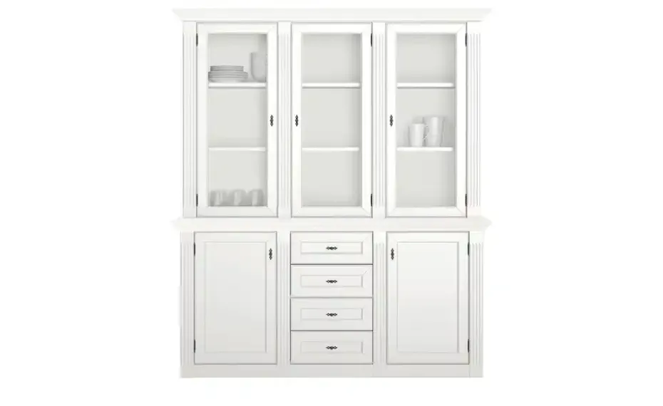 Das Buffet der Serie Petit Chalet überzeugt mit liebevollen Details und seinem charmanten Landhausstil. Die Zierstrukturen befinden sich am Kranz, den Fronten und in Form eines Facettenschliffs an den Glastüren. Nutzen Sie vier blickdichte Fächer, vier Schubkästen und sechs einsehbare Fächer für Geschirr, Aufbewahrungsdosen und Mehr. Das Buffet kann in Küchen, Wohnzimmern oder auch in Esszimmern platziert werden. Gut zu wissen: Dank zeitgemäßer Soft-Close-Funktion schließen die Türen besonders leise.
