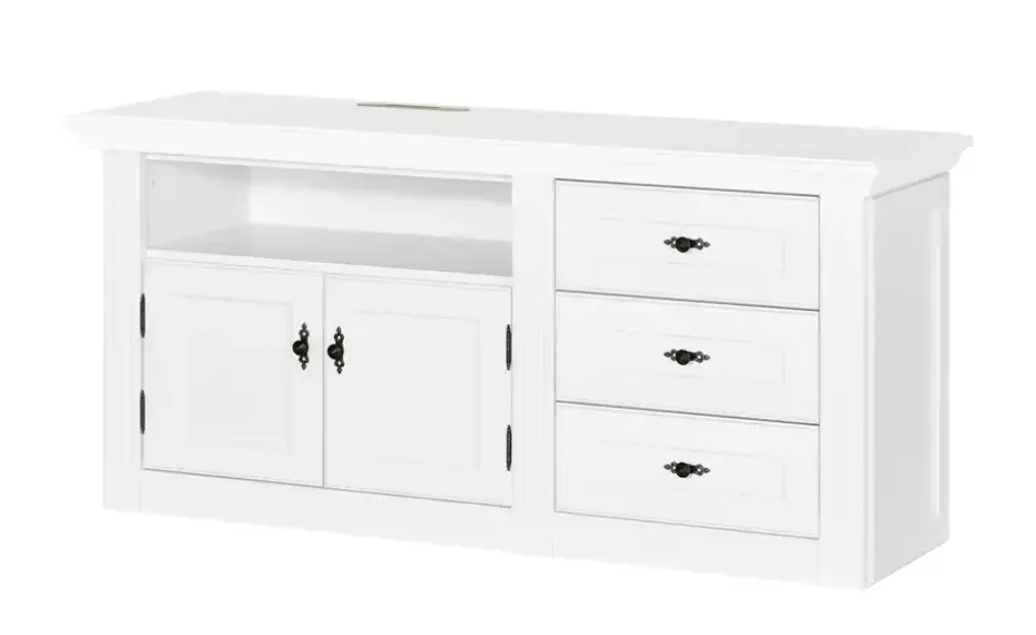 Das TV-Element der Serie Petit Chalet überzeugt mit liebevollen Details und seinem charmanten Landhausstil. Die Zierstrukturen befinden sich an der Abdeckplatte, den beiden Kassettentüren und an den drei Schubkastenfronten. Platzieren Sie Ihren Fernsehbildschirm auf dem TV-Element und bringen Sie DVD-Player oder Spielkonsolen in dem darunterliegenden Fach unter. Die drei Schubfächer sind für Fernbedienungen, Kabel und TV-Zubehör geeignet. Ein blickdichtes Fach hinter den beiden Türen bietet ebenfalls praktischen Stauraum. Gut zu wissen: Dank zeitgemäßer Soft-Close-Funktion schließen die Schubfächer und Türen besonders leise.