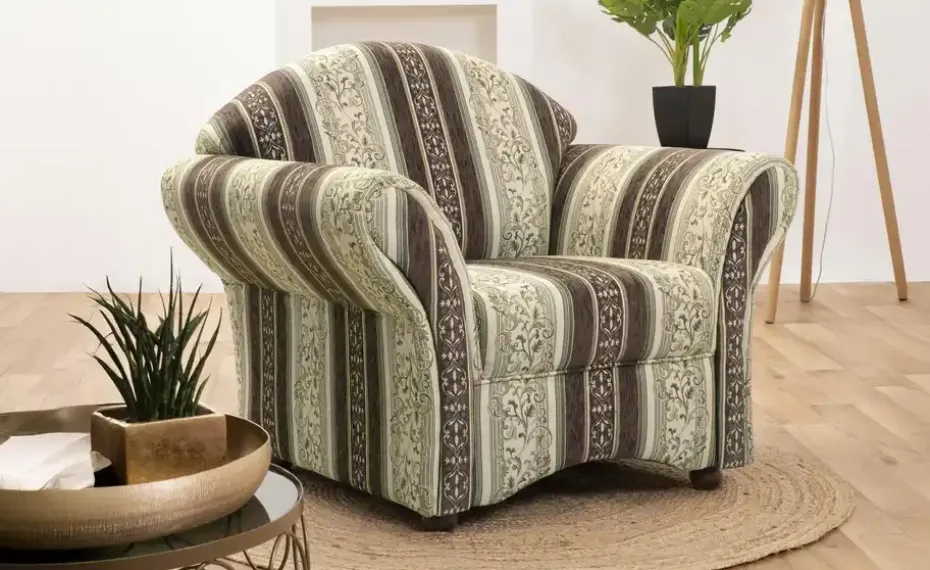 Dieser Sessel zeigt sich mit einem verschnörkelt-verspielten Bezug. Unser Tipp: Ergänzen Sie den komfortablen Sessel mit dem gleichnamigen Hocker, um die Füße hochlegen zu können.