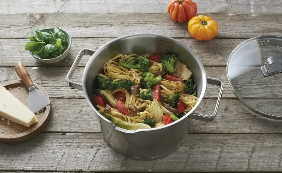 Kochen Sie wie ein Profi – mit Meisterkoch und der Serie KONUS. Sie besteht aus Bratentöpfen in drei Größen – mit 16 cm, 20 cm und 24 cm Durchmesser – und einer passenden Kasserole. Alle vier Modelle sind mit einer praktischen Innenskala ausgestattet. Die serienmäßige Ausgusslippe und das integrierte grobe und feine Sieb im Rand des Glasdeckels erleichtern das Aus- oder Abgießen des Topfinhaltes. Sogenannte Kaltgriffe sorgen dafür, dass Sie die Töpfe auch ohne Topflappen anfassen können. Ihr konisches Design macht die Serie auch optisch zum Highlight in der Küche.