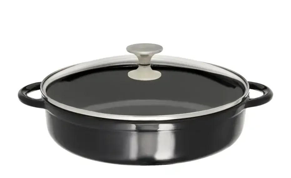 Diese Servierpfanne von Meisterkoch können Sie zum Zubereiten von Speisen und anschließendem Servieren nutzen. Die Pfanne selbst ist aus robustem Gusseisen. Die Oberfläche ist emailliert. Der Deckel ist aus Glas.