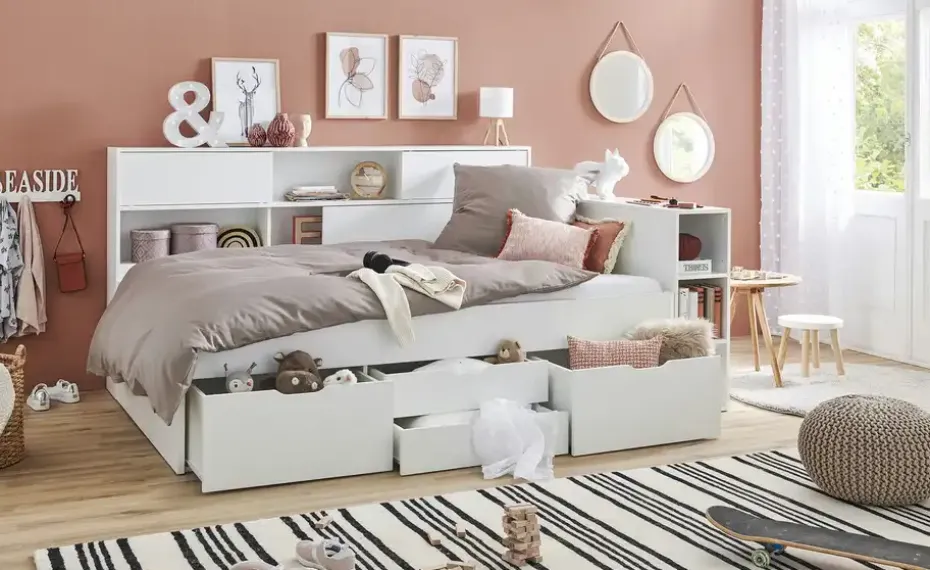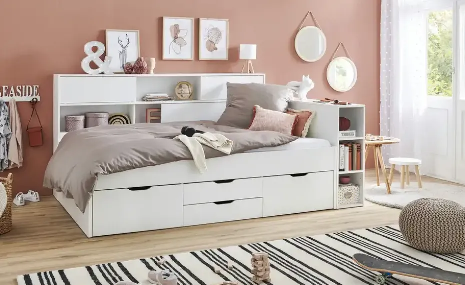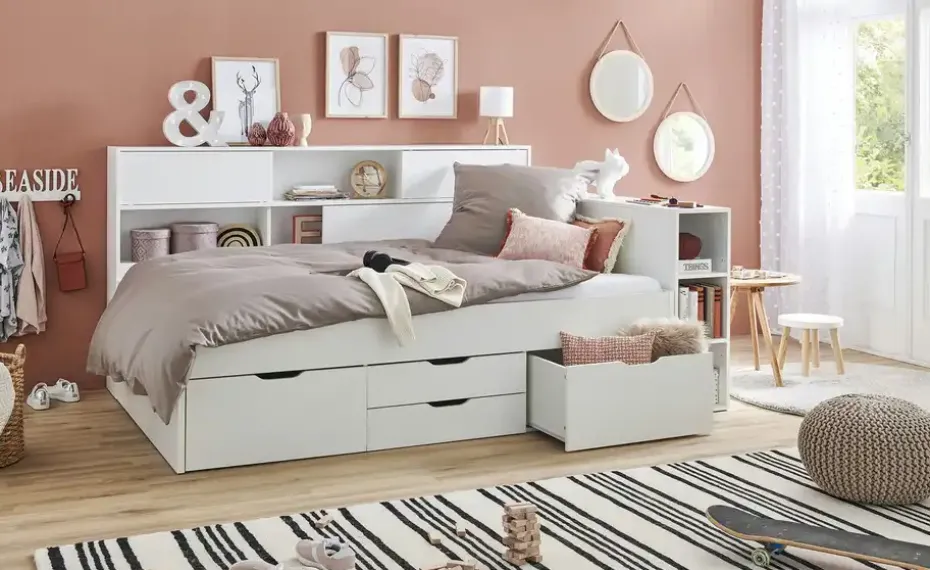mit 4 Schubladen unter dem Bett, Regal mit 3 Fächern, seitlicher Bettkasten mit Klappe, Schiebetürenregal
