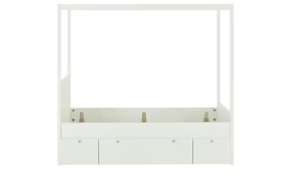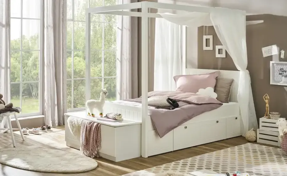 Bei dieser Möbelserie wird zeitloses Weiß mit liebevollen Akzenten kombiniert. Das Ergebnis: Kombinationsfreudige Möbel, die in nahezu jeden Einrichtungsstil passen. Durch vertikale Lamellen an sichtbaren Flächen bekommt die Serie eine attraktive Landhaus-Note. Dieses Himmelbett macht nicht nur optisch etwas her, sondern bietet auch praktischen Stauraum in Form von drei Schubkästen. Hier finden Bettwäsche, Dekodecken und andere Dinge problemlos Platz. Entscheiden Sie selbst, ob Sie den Himmel des Bettes mit leichten Vorhängen, Lichterketten oder vielleicht ja sogar Rankpflanzen verschönern wollen. Übrigens: Die Bettbank der gleichnamigen Serie passt perfekt ans Fußende des Himmelbettes. Sie ist eine praktische Sitzmöglichkeit und bringt unter der Sitzfläche geräumigen Stauraum mit.