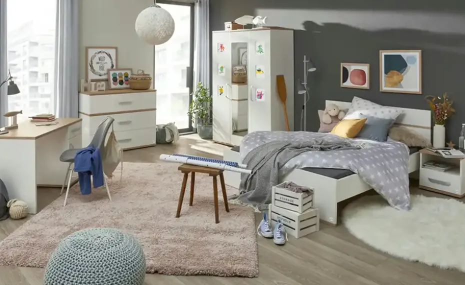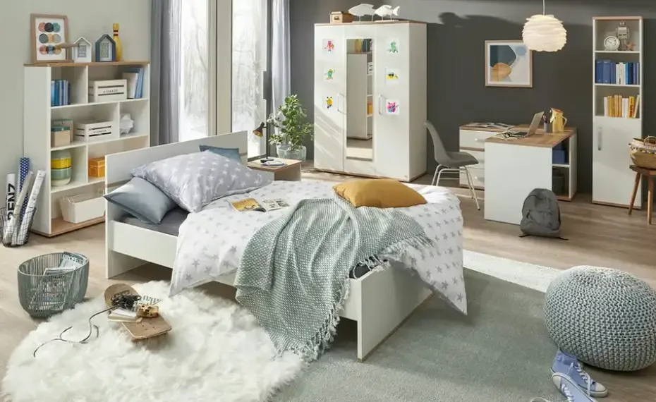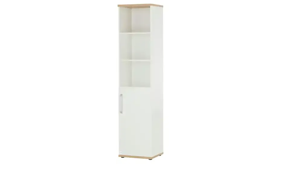 Die Möbelserie Clea besitzt einen strahlend weißen Farbton, der durch Absetzungen in Eichennachbildung akzentuiert wird. Das helle, freundliche Design findet in diversen Baby-, Kinder-, und Jugendzimmer-Konzepten einen Platz. Nutzen Sie die drei offenen Fächer, um Kinderbücher, Fotos oder Kinderbücher in Szene zu setzen. In den beiden darunterliegenden Fächern finden Sie außerdem blickdichten Stauraum. Die Tür davor schließt durch Soft-Close nahezu lautlos.
