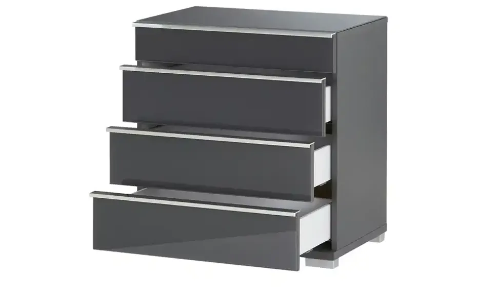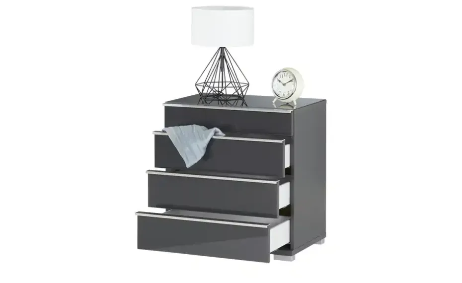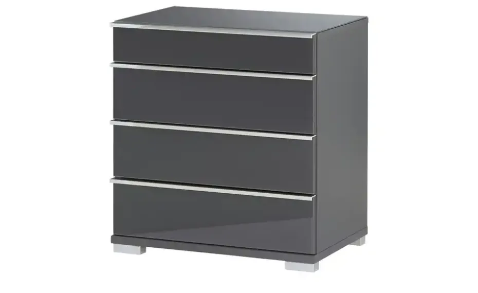 Hochglänzende Fronten und attraktive, chromfarbene Akzente: Die Serie Imola überzeugt mit ihrem modernen Design. Dieses Nachtkommoden-Set besteht aus zwei Nachtkommoden. Beide besitzen vier Schubfächer, die mit einer Schubladendämpfung versehen sind. Die Fronten und die Kommoden-Oberflächen sind mit Glas veredelt und dadurch leicht abwischbar. Die Griffe und die eckigen Füße sind chromfarben. Sie harmonieren mit dem Gesamtdesign der beiden Nachtkommoden.