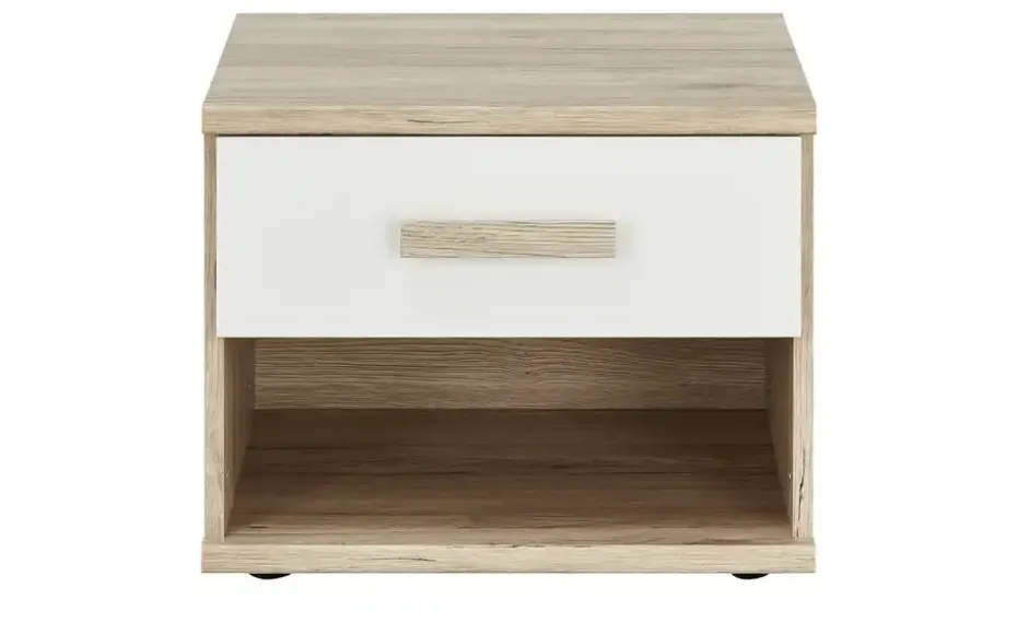 Nachtkommoden ergänzen jedes Bett in praktischer Weise. Hier ist Platz für Nachtischlampe und Wecker. Die Nachtkommode Caja passt zur gleichnamigen Kinder- und Jugendzimmerserie. Sie kann durch ihr neutrales Design in Eiche San Remo (Nachbildung) und Alpinweiß aber auch mit anderen Möbeln kombiniert werden. Caja verfügt über eine Schublade und ein offenes Fach.