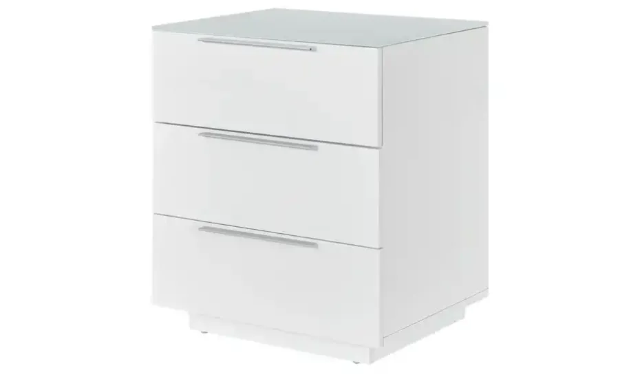 Mit ihrem klaren reduzierten Design in Weiß fügt sich die Nachtkommode Plymouth gut in vorhandene Einrichtungen ein. Ein Eyecatcher der Kommode ist die edle Hochglanzoberfläche. Die schmalen Griffleisten in Aluoptik setzen zusätzliche Akzente. Plymouth ist hochwertig lackiert; einzig die Abdeckplatte besteht aus Weißglas. Die Kommode sieht aber nicht nur attraktiv aus, sie bietet auch Stauraum: Ihnen stehen drei geräumige Schubladen zur Verfügung.