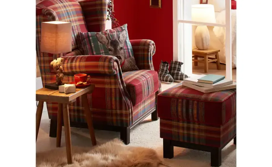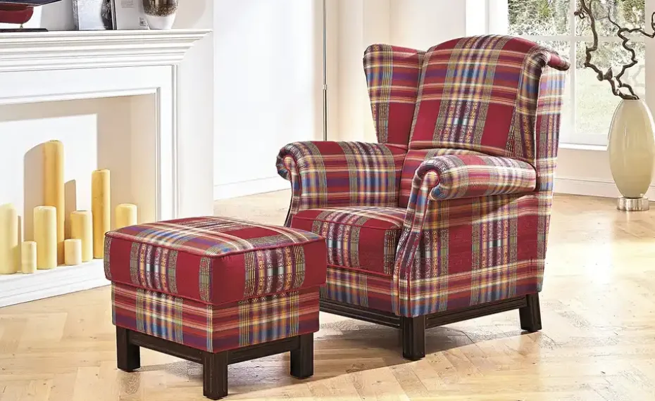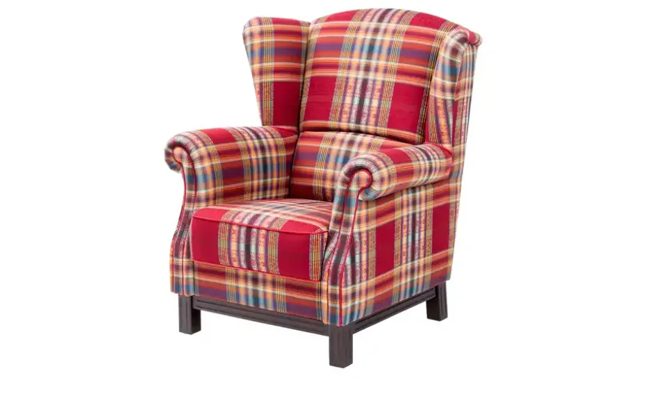 Dieser stilvolle Ohrensessel überzeugt durch sein auffälliges Design mit einem roten Karo-Muster. Die dunklen Holzfüße bilden einen optischen Kontrast. Der Ohrensessel kann in jedem Wohnzimmer einen Akzent setzen und eignet sich ebenfalls als Ergänzung für die dort bereits vorhandenen Sitzmöbel. Auch in eher dezenten Jugend- oder Lesezimmern bietet er eine komfortable Sitzgelegenheit und lockert die Atmosphäre auf. Die gepolsterten Rücken- und Armlehnen des Sessels laden zu langen Lese- und Fernsehabenden ein. Mit dem passenden Hocker haben Sie die Möglichkeit, auch Ihren Füßen am Feierabend eine Pause zu gönnen.