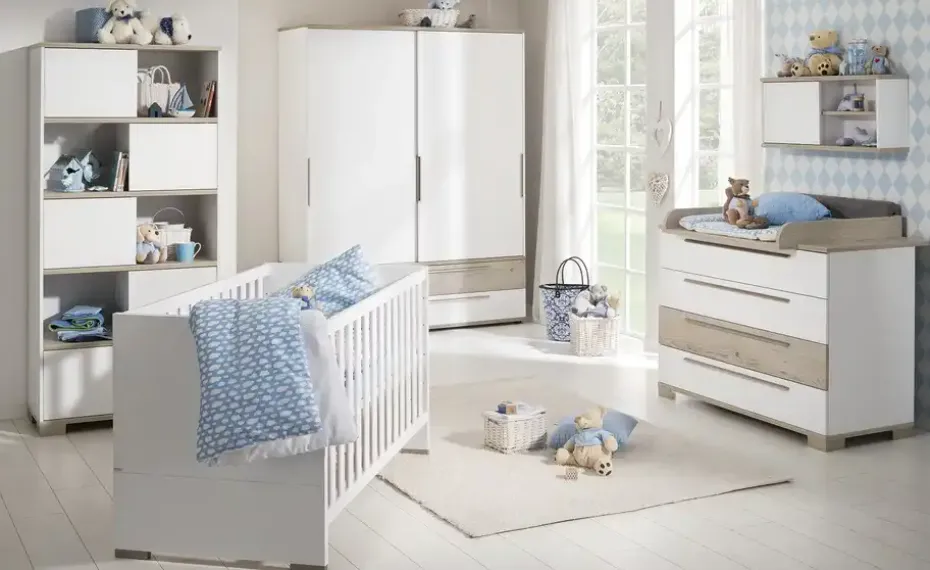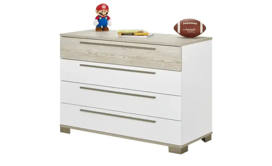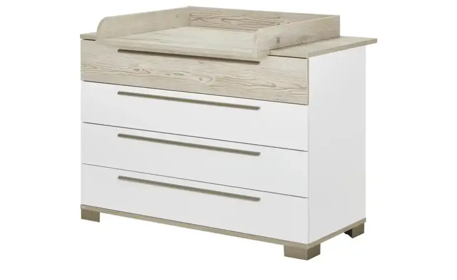 Die Kommode Carlo von PAIDI passt gleichermaßen ins Baby- und Kinderzimmer. Sie verfügt über vier geräumige Schubladen mit viel Platz im Inneren. Alle vier sind mit einer Soft-Close-Funktion ausgestattet. Deshalb schließen sie richtig leise. Korpus und Front sind foliert und mit einer zusätzlichen Melaminbeschichtung versehen. Das macht die Oberflächen kratzerunempfindlich. Zudem sind sie leicht zu pflegen. Carlo hat einen attraktiven kreideweißen Farbton. Die obere Schublade und die Abdeckplatte setzen sich in Fichte-Vintage (Nachbildung) ab. Wie die anderen Möbel der Serie, ist auch die Kommode hochwertig gearbeitet und bietet eine zertifizierte PAIDI Qualität. Sie können die Kommode mit einem separaten Wickelaufsatz ergänzen.