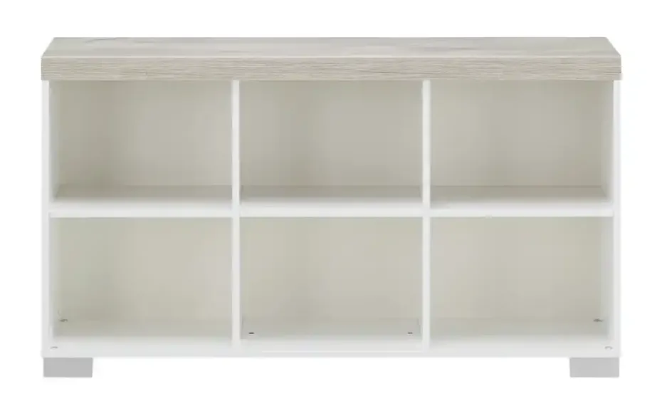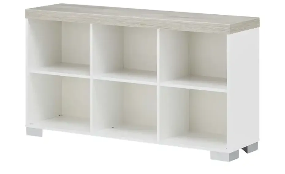 Gleich sechs praktische Fächer hat das Regal Kira von PAIDI. Jeweils drei sind nebeneinander in zwei Reihen angelegt. Korpus und Böden sind in Kreideweiß designt, die Abdeckplatte setzt sich in Eiche (Nachbildung) ab. Sie hat eine holztypische Oberflächenstruktur, die die Nachbildung noch echter wirken lässt. Das Regal hat eine erstklassige Qualität und ist mit diversen Gütesiegeln ausgezeichnet.