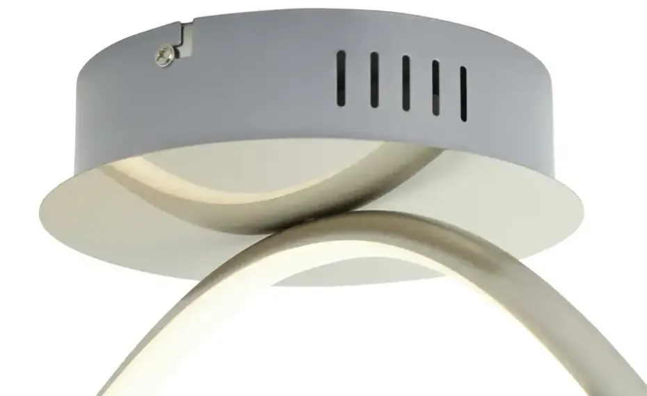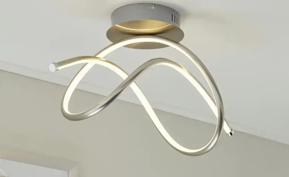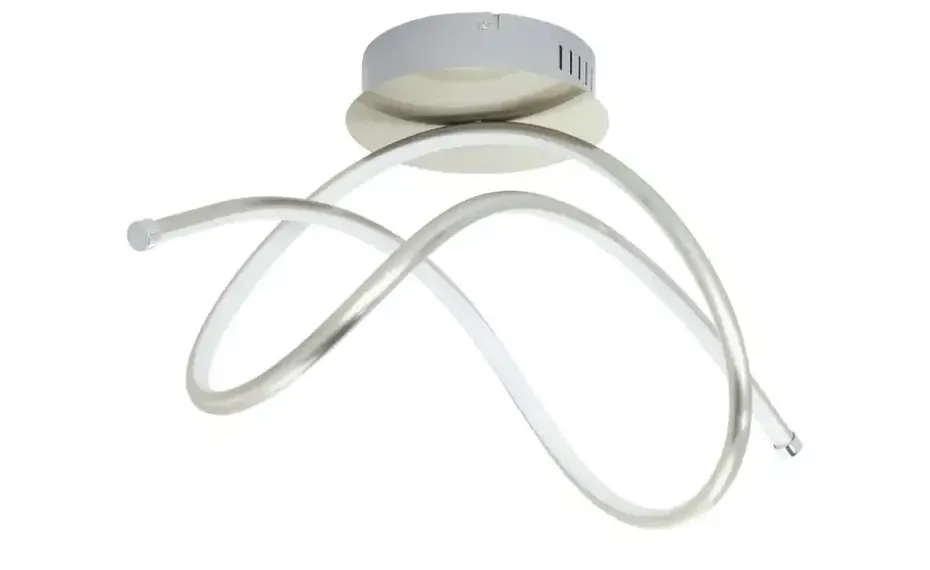 Diese LED-Deckenleuchte überzeugt mit einem besonderen, geschwungenen Design. Die aus Aluminium gefertigte, silberfarbene Deckenlampe wird inklusive einem LED Leuchtmittel geliefert. Bei einer Farbtemperatur von 3000 Kelvin gibt das Leuchtmittel ein angenehmes, warmweißes Licht ab. Durch die integrierte LED-Technik überzeugt die Leuchte mit einem niedrigen Energieverbrauch, einer langen Lebensdauer sowie einer geringen Wärmeentwicklung. Durch das moderne Design können Sie diese LED Deckenlampe in vielen verschiedenen Räumen einsetzen.