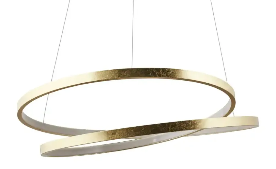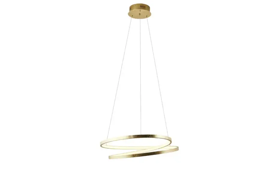 Diese LED-Pendelleuchte überzeugt mit ihrem edlen, besonderen Design. Der geschwungenen Leuchtkörper mit seinen goldfarbenen Akzenten verleiht der Deckenleuchte das gewisse Etwas. Die Leuchte ist mit der neuen simply dim-Technologie ausgestattet. Diese macht es möglich, dass Ihre Leuchte über einen vorhandenen Lichtschalter, ganz egal ob Kipp-, Zug-, Schnur- oder Wandschalter, gedimmt werden kann. Der simply dim-Driver steuert die Helligkeit über den Schaltimpuls und so kann die Leuchte von 100 % bis runter auf 10 % der Lichtintensität stufenlos gedimmt werden. Wird die Leuchte weniger als 3 sek. nach dem Ausschalten wieder angeschaltet, startet der Dimmvorgang. Hat sie den hellsten (100 %) bzw. dunkelsten Wert (10 %) erreicht, verweilt sie ca. 2 sek. auf dieser Einstellung, um den Dimmvorgang abermals zu starten. Erstrahlt die Leuchte während eines Dimmvorgangs in der gewünschten Helligkeit, können Sie durch Ausschalten der Leuchte die Lichtintensität abspeichern. Schalten Sie die Leuchte nun wieder an, scheint die Leuchte in der gespeicherten Helligkeit und diese Einstellung bleibt erhalten. Die Leuchte hat einen Durchmesser von 55 cm und eine Abhängung von 120 cm.