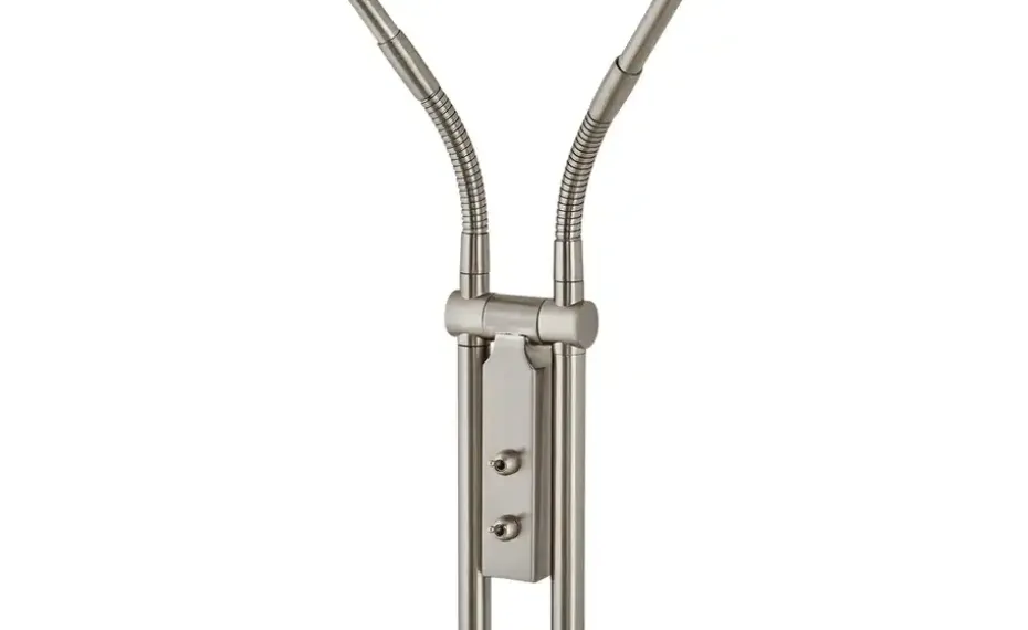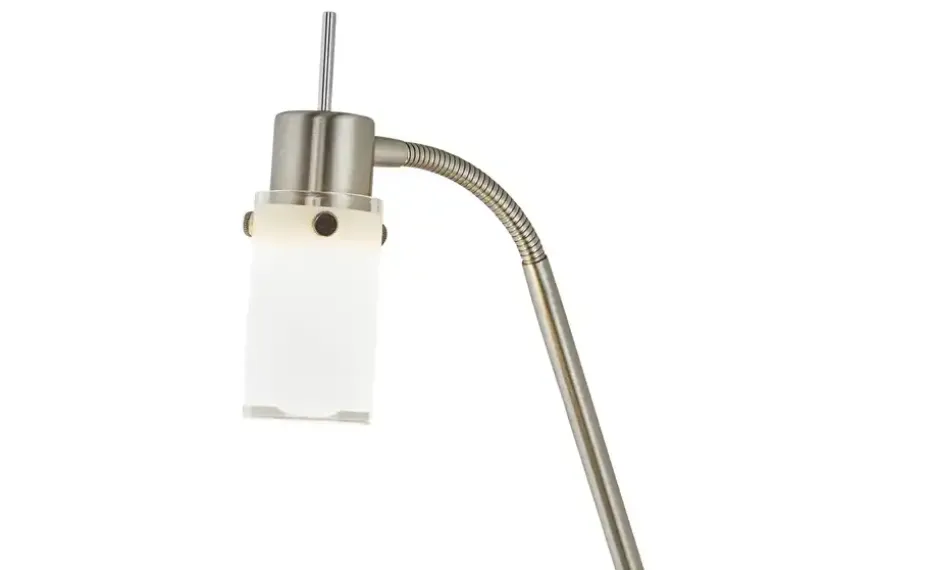 Diese zweiflammige Stehleuchte besticht mit schlichtem aber dennoch modernem Design. Die aus Metall gefertigte Leuchte wird inklusive zwei 4 Watt LED-Leuchtmittel geliefert. Das Leuchtmittel strahlt rund 420 Lumen aus und wirkt mit einer Farbtemperatur von 3.000 Kelvin angenehm warmweiß. Durch das teilsatinierte Glas gibt die Leuchte ein schönes, effektvolles und blendfreies Licht ab. Dank der Schwanenhälse können Sie die Leuchtenköpfe nach Belieben verstellen und Ihren Wohnraum gezielt beleuchten. Die Stehleuchte lässt sich bequem getrennt durch zwei Kippschalter an-bzw. ausschalten.