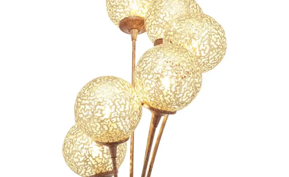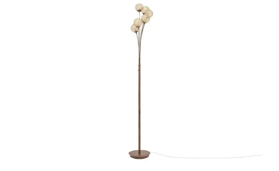 Diese Stehleuchte lässt Ihre Wohnräume warm erstrahlen. Die Kombination aus rostfarbenem Stahl und den goldfarbenen Leuchtkugeln gibt der Leuchte das gewisse Etwas. Die Stehleuchte ist mit einem Kippschalter ausgestattet über den sie bequem an- und ausgeschaltet werden kann. Sie wird ohne Leuchtmittel geliefert, sodass Sie die Möglichkeit haben, die Leuchte mit Leuchtmitteln ganz nach Ihrem Geschmack zu bestücken. Die Stehleuchte gibt durch die goldenen Leuchtkugeln ein schönes Lichtspiel wieder und erfüllt einen absoluten, dekorativen Zweck.