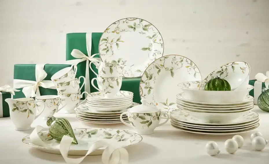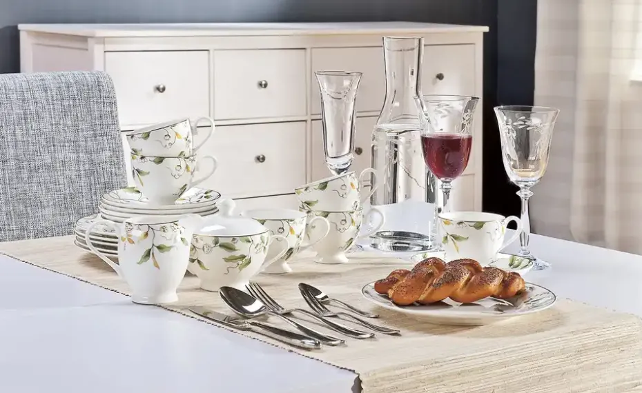 Wenn Sie Ihren Gästen Frühstücksbrötchen oder Kuchen anbieten, kommt das Service aus der Serie Firenze von Peill & Putzler auf den Tisch. Es handelt sich um ein Kaffeegeschirr mit einem naturverbundenen Dekor auf weißem Grund: Blüten und Blätter ranken sich in Grün- und Gelbtönen charmant auf der Fläche und sorgen für ein feingliedriges Muster. Jeweils sechs Tassen, Unterteller und Kuchenteller sowie Zuckerdose und Milchkännchen warten auf eine gemütliche Plauderstunde am Morgen oder Nachmittag. Das Service besteht aus feinstem Bone China-Porzellan und ist besonderslichtdurchlässig und transparent.