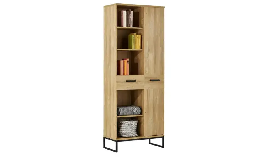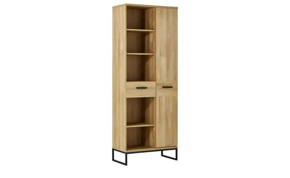 Medebach ist ein praktisches Regal für Wohnraum, Essbereich oder auch Arbeitszimmer. Auf der linken Seite verfügt es über fünf geräumige Regalfächer und eine Schublade. Sechs stehen Ihnen sechs weitere Fächer zur Verfügung, hier ist allerdings eine große Drehtür davor. Die Einlegeböden sind teilweise in der Höhe verstellbar. Die Oberflächen sind mit Melamin beschichtet und deshalb besonders widerstandsfähig. Das Dekor in Grandson Eiche (Nachbildung) überzeugt mit einer natürlichen Maserung.
