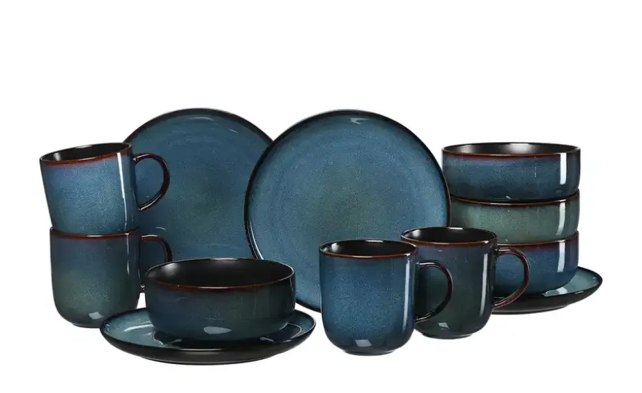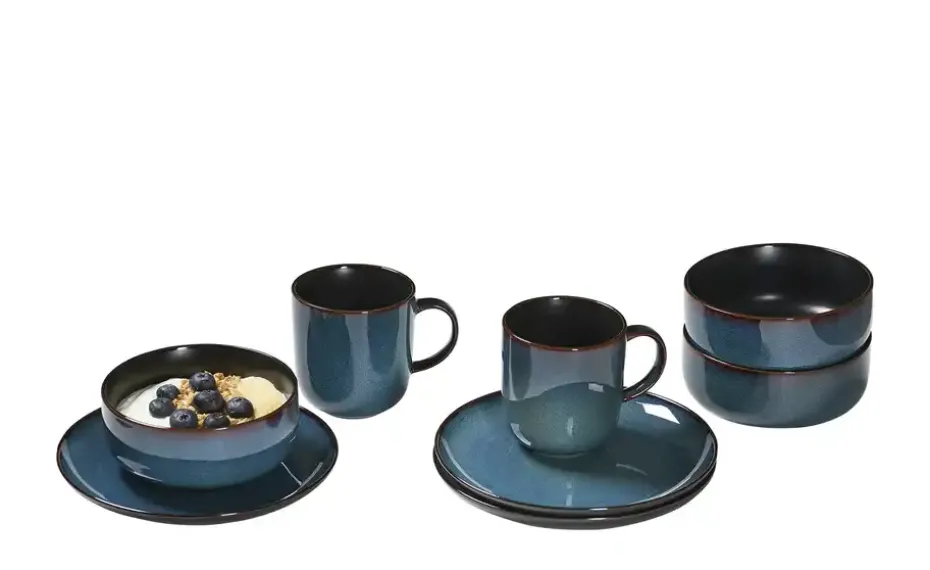 Natürlich trendig: Das Frühstücksservice Bali versprüht einen entspannt handwerklichen Urban-Country-Charme. Da sich die blauen Farbverläufe und Strukturen auf Basis einer Reaktivglasur während des Brennvorgangs völlig individuell entwickeln, hat jedes Geschirrteil Unikat-Charakter, der zudem durch handgemalte Farbkanten bei Bechern und Schalen geprägt wird. Die Flächen in seidenmattem Schwarz bilden auf der schlichten Coupeform einen schönen Kontrast zu den glänzenden Farbflächen und geben dem Geschirr einen markanten Charakter.