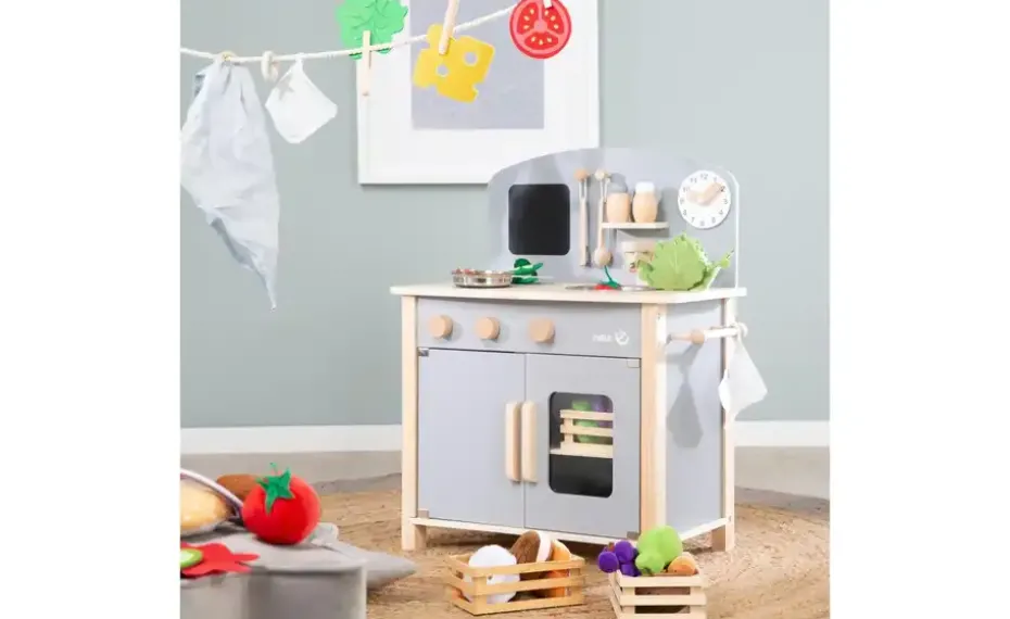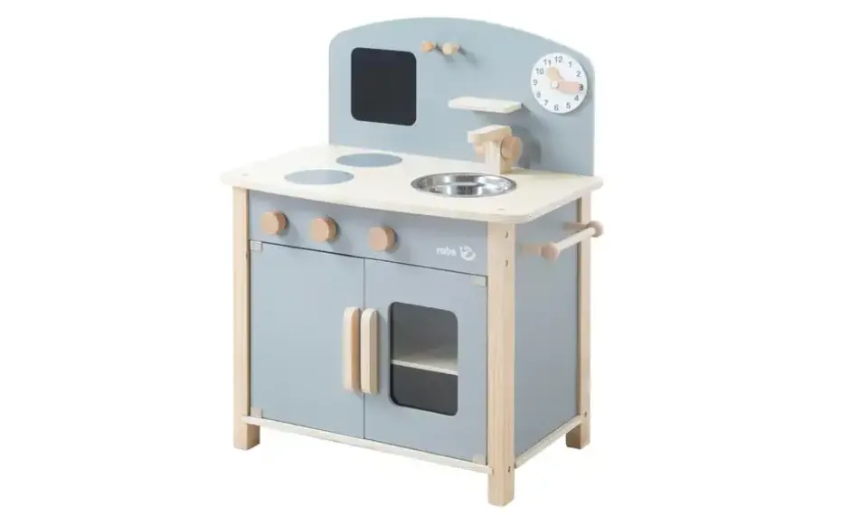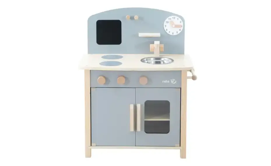 Die roba Spielküche ist ein wahres Platzsparwunder. Dennoch kommen kleine Nachwuchsköchinnen und -köche voll auf ihre Kosten. Denn ein wahres Kochtalent entfaltet sein Können selbst in einer kleinen Kinderküche.Die Kinderküche besitzt einen Herd mit zwei Kochstellen, einen Backofen mit Tür, ein Schränkchen und eine Spüle inkl. Wasserhahn mit drei Deko-Knöpfen.Durch das durchsichtige Fenster am Backofen kann Ihr Kind das Bratgut oder den Kuchen im Auge behalten. Mithilfe der Uhr und deren drehbaren Zeigern wird auch das Lernen von Uhrzeiten spielerisch gefördert.Die geräumige Spielzeugküche inkl. Schrank und diversen Aufhängungsmöglichkeiten bietet jede Menge Stauraum. So finden Kaufladen-Lebensmittel und das mitgelieferte umfangreiche Küchenzubehör (u. a. Kochlöffel, Pfanne, Schneebesen, Pfannenwender, Salz- & Pfefferstreuer und Topflappen) in der Spielzeug-Küchenzeile ihren Platz.Dem sofortigen Spielstart steht also nichts mehr im Wege! Die Kinderspielküche wird zerlegt geliefert. Die Montage ist kinderleicht. Die roba Spielküche wurde nach der europäischen Sicherheitsnorm für Spielzeug EN 71 in Deutschland entwickelt.