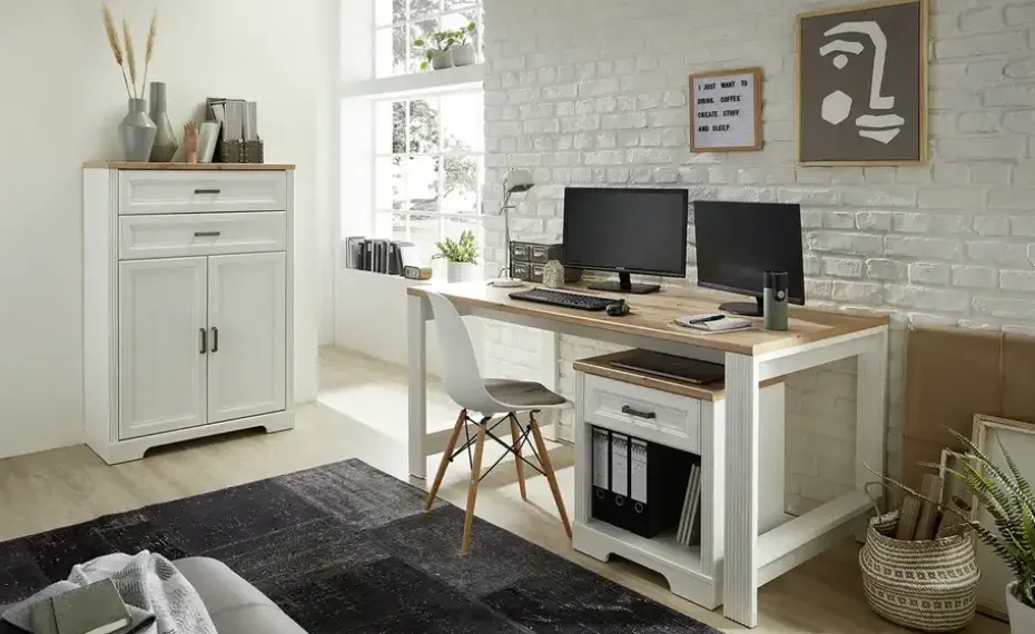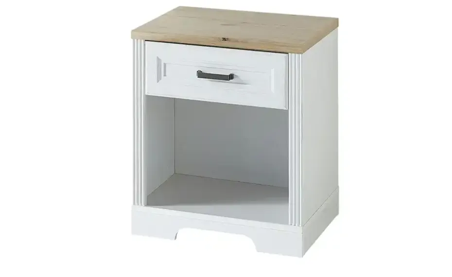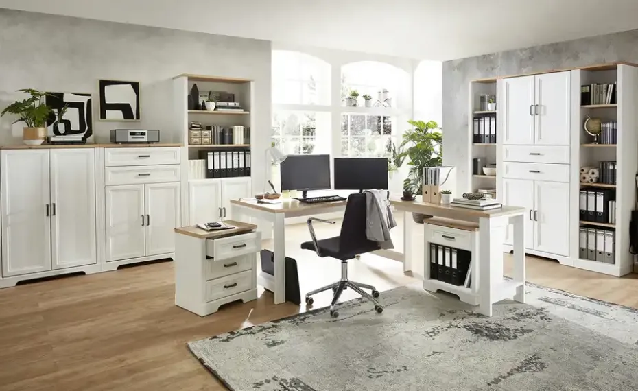 Dieser Rollcontainer im Landhausstil passt perfekt unter Schreibtische und in nahezu jedes Arbeitszimmer. Ein offenes Fach für Aktenordner und ein Schubfach mit blickdichtem Stauraum stehen Ihnen für Ihr Bürozubehör zur Verfügung. Die Abdeckplatte aus authentischer Asteichen-Nachbildung setzt einen bewussten Kontrast und betont den Landhausstil gekonnt.