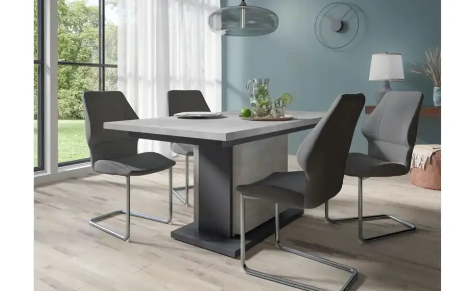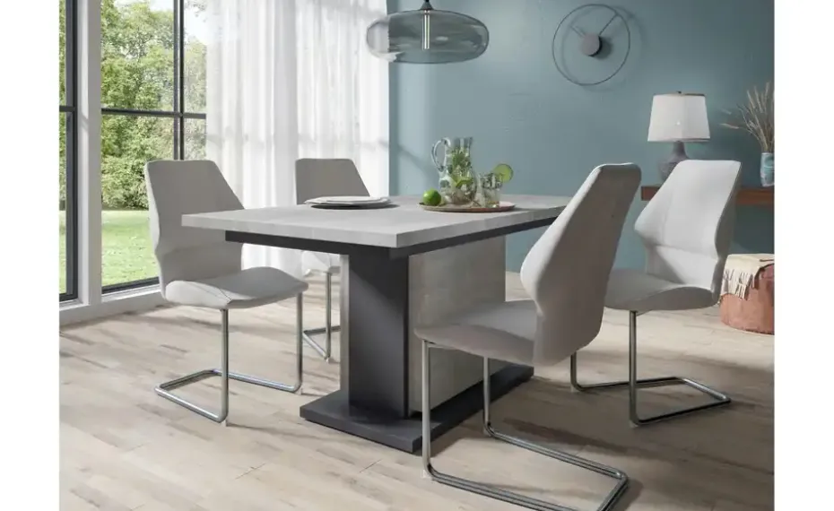 Durch die attraktive Betonoptik passt dieser Esstisch in zahlreiche Esszimmer, Küchen und Wohnzimmer. Das zeitlose Design ermöglicht es außerdem, bereits vorhandene Essstühle problemlos zum Tisch zu kombinieren. Der Esstisch besitzt einen integrierten Auszug, sodass bei Bedarf Platz für zwei weitere Personen geschaffen werden kann.