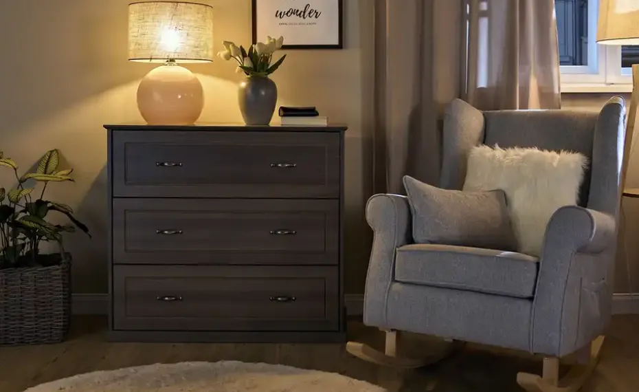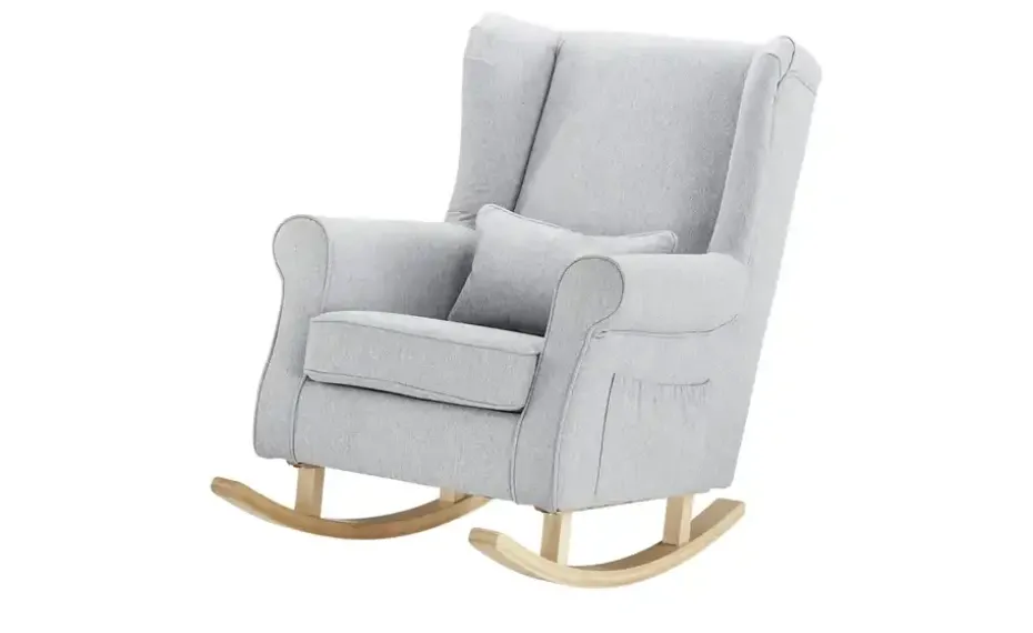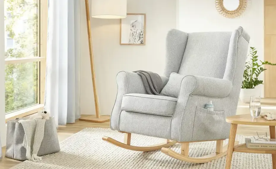 Dieser Schaukelsessel lädt zum Entspannen ein und eignet sich außerdem als Stillsessel. Nehmen Sie Platz und machen Sie es sich bequem. Rücken Sie sich das mitgelieferte Nierenkissen zurecht und lehnen Sie sich gemütlich an die Ohren des Sessels an. Verstauen Sie Babyflasche, Handy oder Fernbedienung in den praktischen Seitentaschen. Auf jeder Sesselseite steht Ihnen eine Tasche zur Verfügung. Der Schaukelsessel passt zu diversen Einrichtungsstilen und kann mit eigenen Decken und Kissen individualisiert werden.