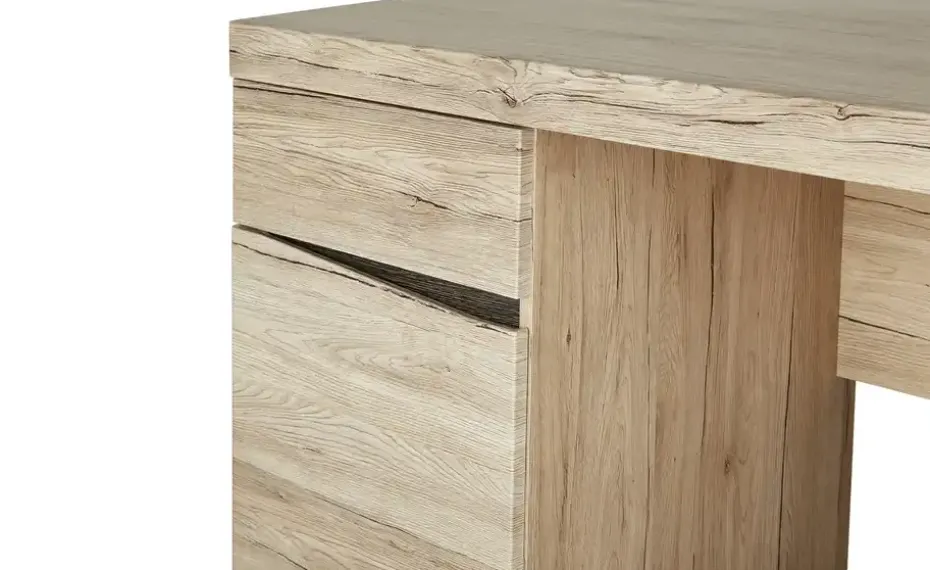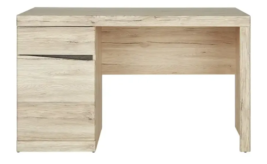 Der Schreibtisch Summer bietet eine praktische Arbeitsfläche und Stauraum. Auf der linken Tischseite befinden sich eine Schublade und eine Tür. Beide sind mit einem Dämpfer ausgestattet und schließen geräuscharm. Hinter der Tür stehen Ihnen wiederum zwei geräumige Fächer zur Verfügung. Nutzen Sie den Platz für Schreibutensilien und anderen Bürobedarf. Alle Oberflächen sind mit Melamin beschichtet. Das macht sie unempfindlich für Kratzer.