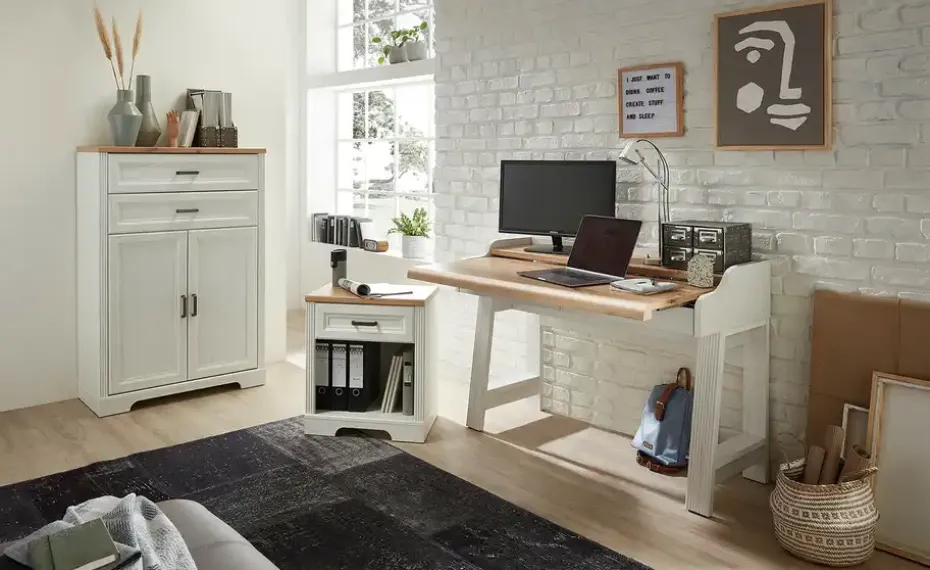 Dieser Schreibtisch passt perfekt zur gleichnamigen Serie und bringt den attraktiven Landhausstil direkt ins Arbeitszimmer. Dank der zwei Ebenen können Sie leichter Ordnung halten. Die untere Ebene lässt sich bei Bedarf ausziehen, sodass Sie ausreichend Platz zum Arbeiten haben. Zwei Schubkästen darunter bieten praktischen, blickdichten Stauraum.