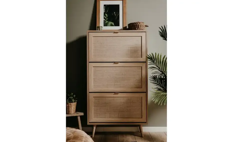 Hell, freundlich und ein kleines Raumwunder: Im Schuhschrank Rafia finden bis zu zwölf Schuhpaare problemlos Platz. Seine drei blickdichten Kipptüren sind mit einer authentisch wirkenden Bast-Geflecht-Imitation verziert. Vier schräg zulaufende Kegelfüße aus massiver Eiche geben dem Schrank einen stabilen Stand. Die Serie Rafia erinnert an den beliebten Boho-Stil und fügt sich in nahezu alle Einrichtungskonzepte problemlos ein.