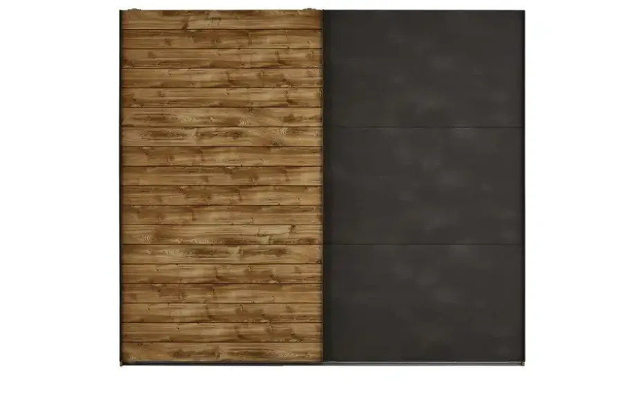 Durch seinen Industrial-Charme zieht der Schwebetürenschrank Durham alle Blicke auf sich. Korpus und eine Schranktür haben ein Dekor in Plankeneiche (Nachbildung). Seine ausgeprägte Maserung und der dunkle Holzton lassen das Dekor besonders rustikal wirken. Ein starker Kontrast dazu ist die andere Tür in Stahloptik. Um das besondere Design noch mehr hervorzuheben, ist Durham mit Metallabsetzungen versehen. Das Schrankinnere unterteilt sich in drei Bereiche. Je Element stehen Ihnen ein Boden und eine Kleiderstange zur Verfügung. Genügend Platz also für Ihre Kleidung.