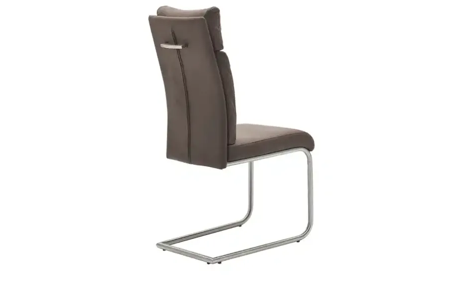 Mit seiner extra dicken Polsterung ist der Schwingstuhl Paul richtig gemütlich. Die Rückenlehne ist hoch designt, so dass Sie sich bequem anlehnen können. Auf der Rückseite der Lehne befindet sich ein praktischer Griff. Er ist – passend zum Gestell – aus Edelstahl gefertigt. Die Oberfläche ist matt gebürstet. Für den Bezug ist braune Mikrofaser verwendet worden. Sie hat eine Kunstlederoptik.