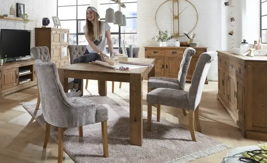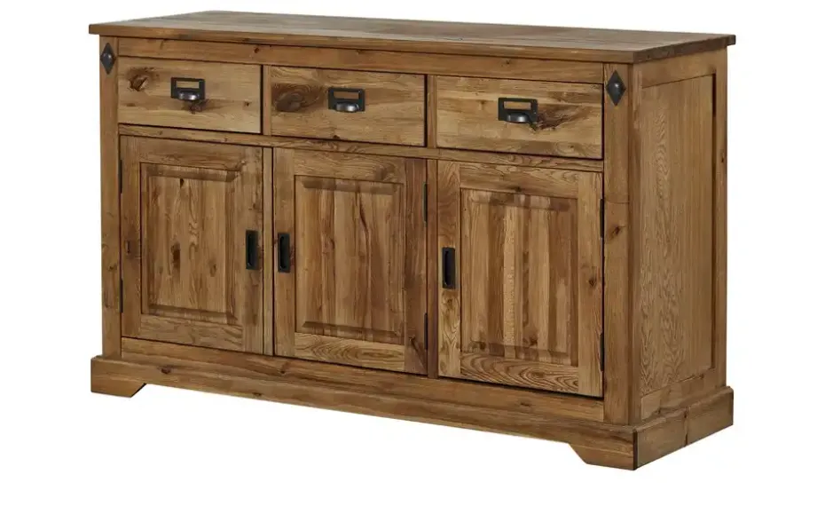Der rustikale Vintage-Look macht das Sideboard Freddy zum Highlight Ihres Wohnraumes. Alleinstehend kommt es sehr gut zur Geltung, kann aber auch mit den anderen Möbeln der Serie Freddy kombiniert werden. Rahmen, Front und Abdeckplatte sind aus massiver Eiche. Korpus und Einlegeböden sind mit Eichenholz furniert. Die Oberfläche wurde geölt, wodurch die ansprechende Antik-Optik entstanden ist. Diese wird durch die dunklen, abgenutzten Beschläge und Apothekergriffe aus Eisen aufgegriffen. Freddy bietet Ihnen vielfältige Staumöglichkeiten. So zum Beispiel in drei Schubläden. Des Weiteren ist das Sideboard mit vier Fächern ausgestattet. Diese werden durch Einlegeböden voneinander getrennt und durch drei Türen geschlossen.