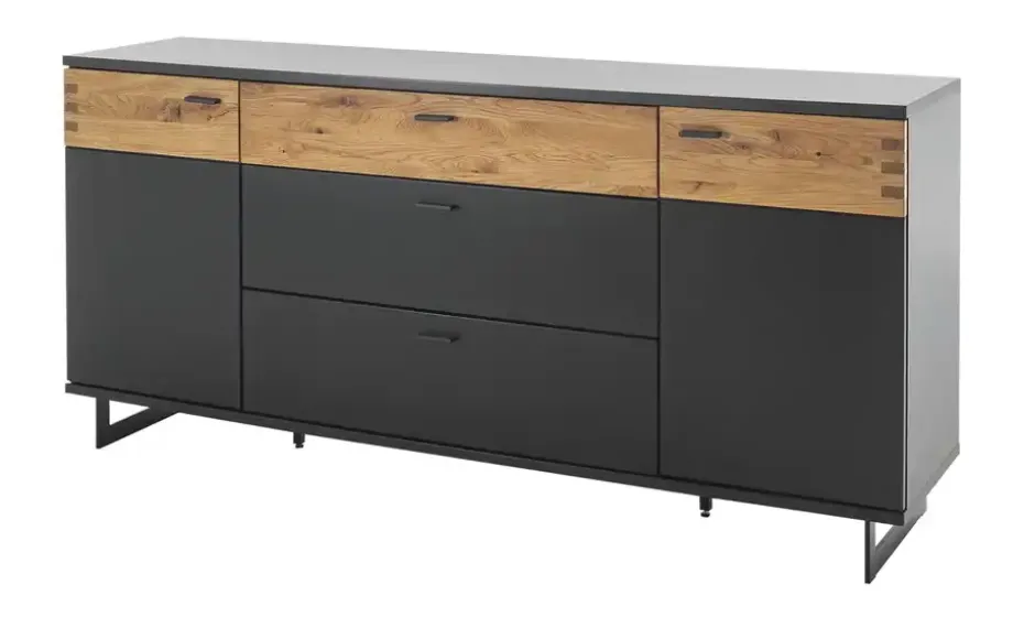 Front aus Holzwerkstoff lackiert in Schwarzgrau / Absetzung aus Massivholz in Wildeiche geölt mit durchgehender Lamelle